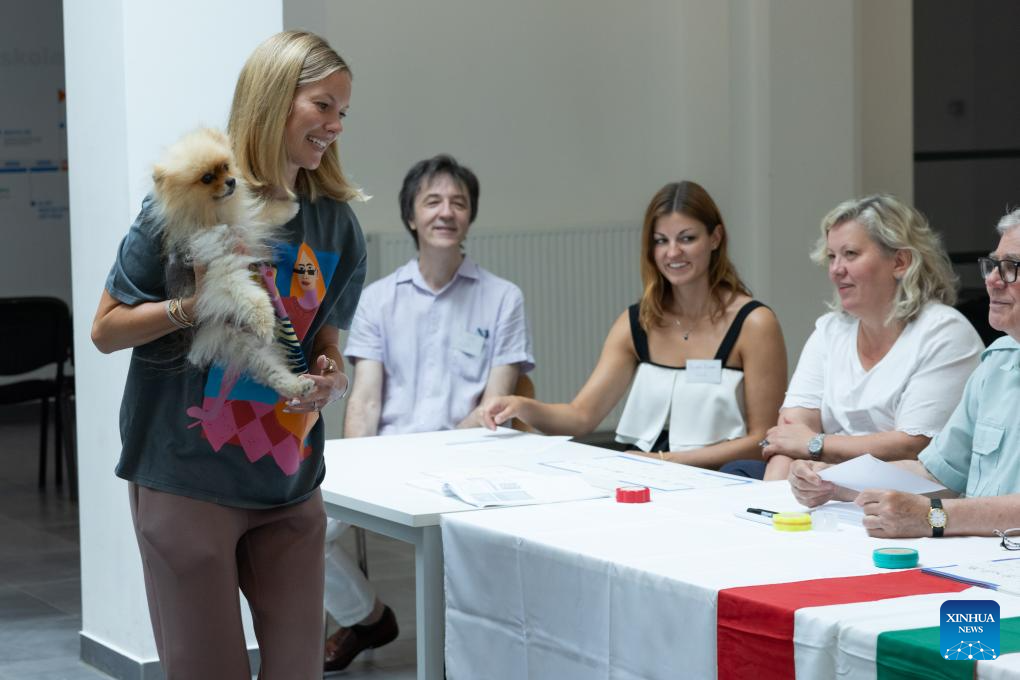A woman arrives with her dog to vote for the European Parliament elections at a polling station in Budapest, Hungary, June 9, 2024. (Photo by Attila Volgyi/Xinhua)