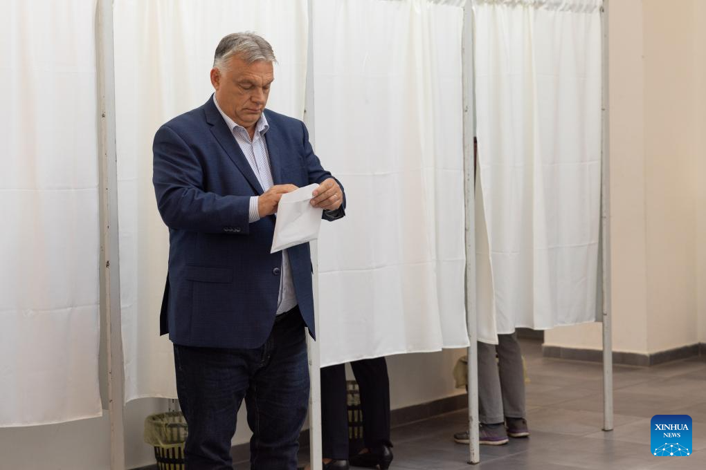 Hungarian Prime Minister Viktor Orban prepares to vote for the European Parliament elections at a polling station in Budapest, Hungary, June 9, 2024. (Photo by Attila Volgyi/Xinhua)