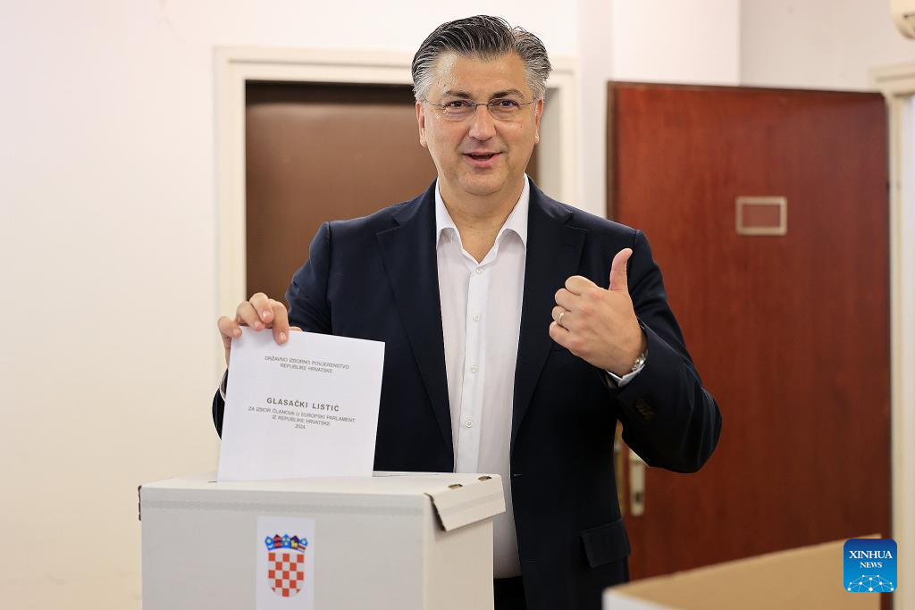 Croatian Prime Minister Andrej Plenkovic votes for the European Parliament elections at a polling station in Zagreb, Croatia, June 9, 2024. (Marko Prpic/Pixsell/Handout via Xinhua)