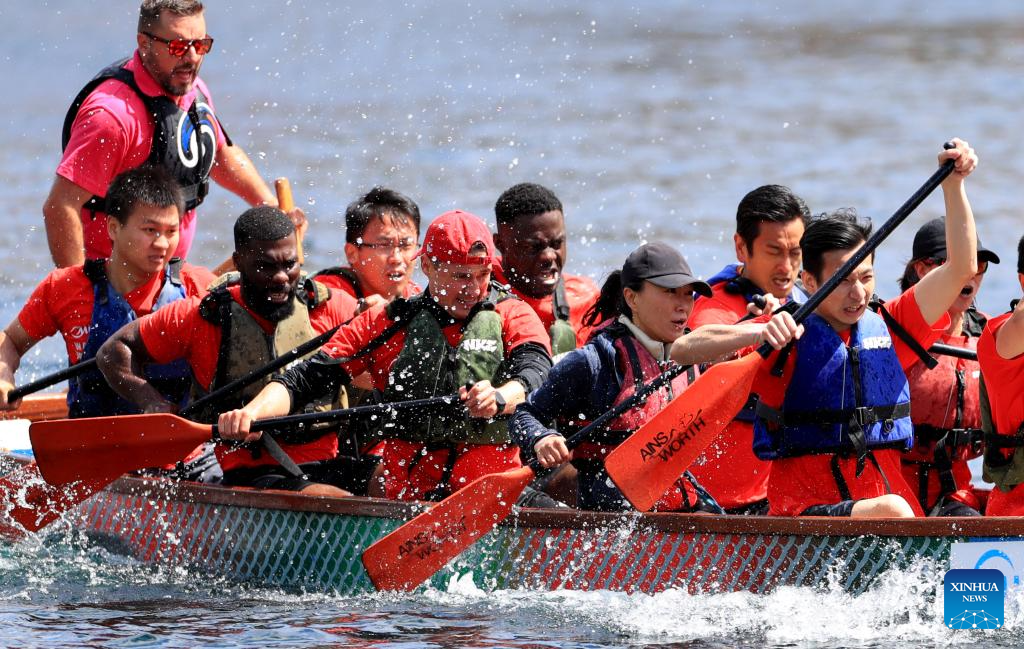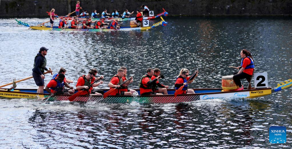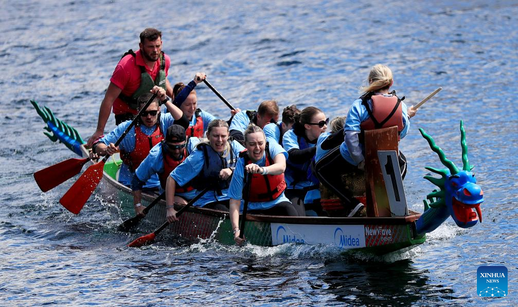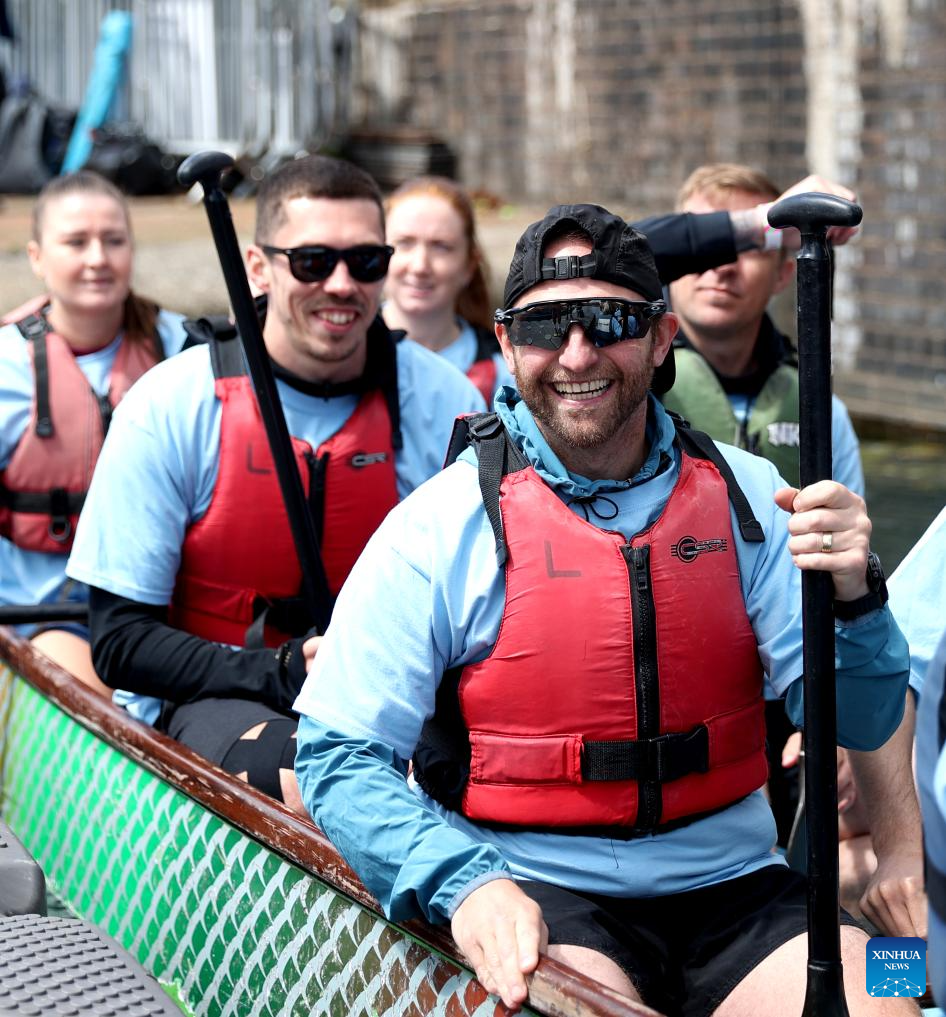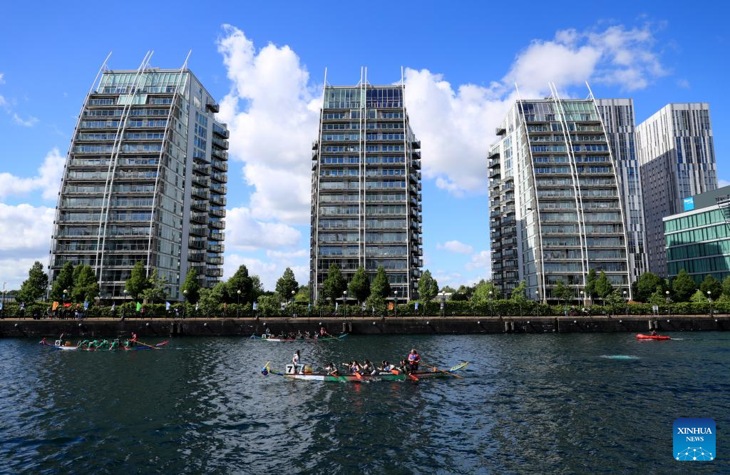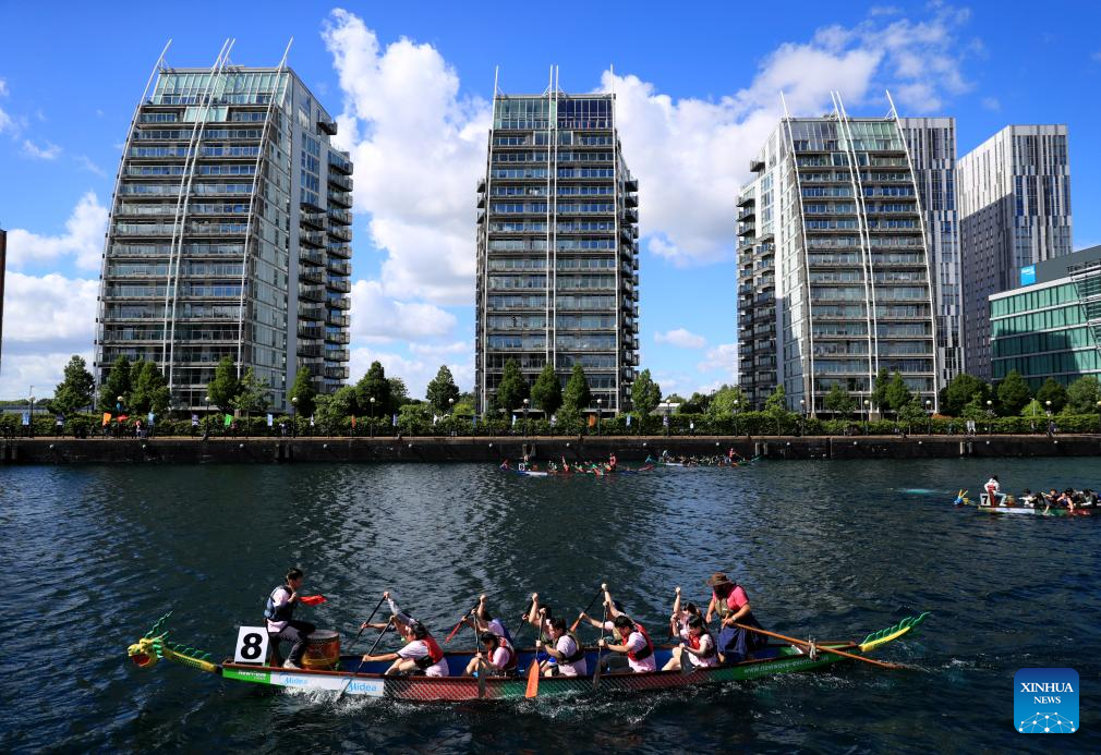 Teams compete during the 2024 UK Chinese Dragon Boat Festival in Salford, Britain, June 8, 2024. (Xinhua/Li Ying)