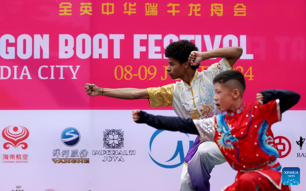 Actors perform Chinese martial arts during the 2024 UK Chinese Dragon Boat Festival in Salford, Britain, June 8, 2024. (Xinhua/Li Ying)