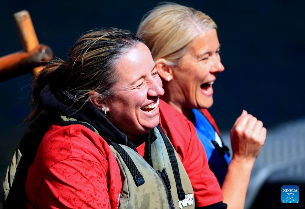 Players react during the 2024 UK Chinese Dragon Boat Festival in Salford, Britain, June 8, 2024. (Xinhua/Li Ying)