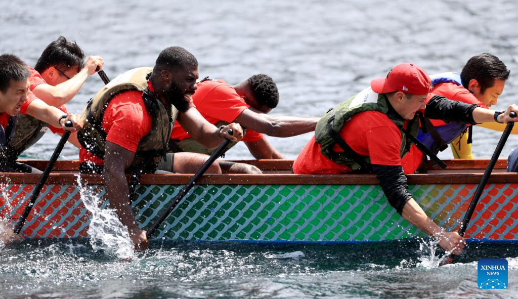 Players compete during the 2024 UK Chinese Dragon Boat Festival in Salford, Britain, June 8, 2024. (Xinhua/Li Ying)