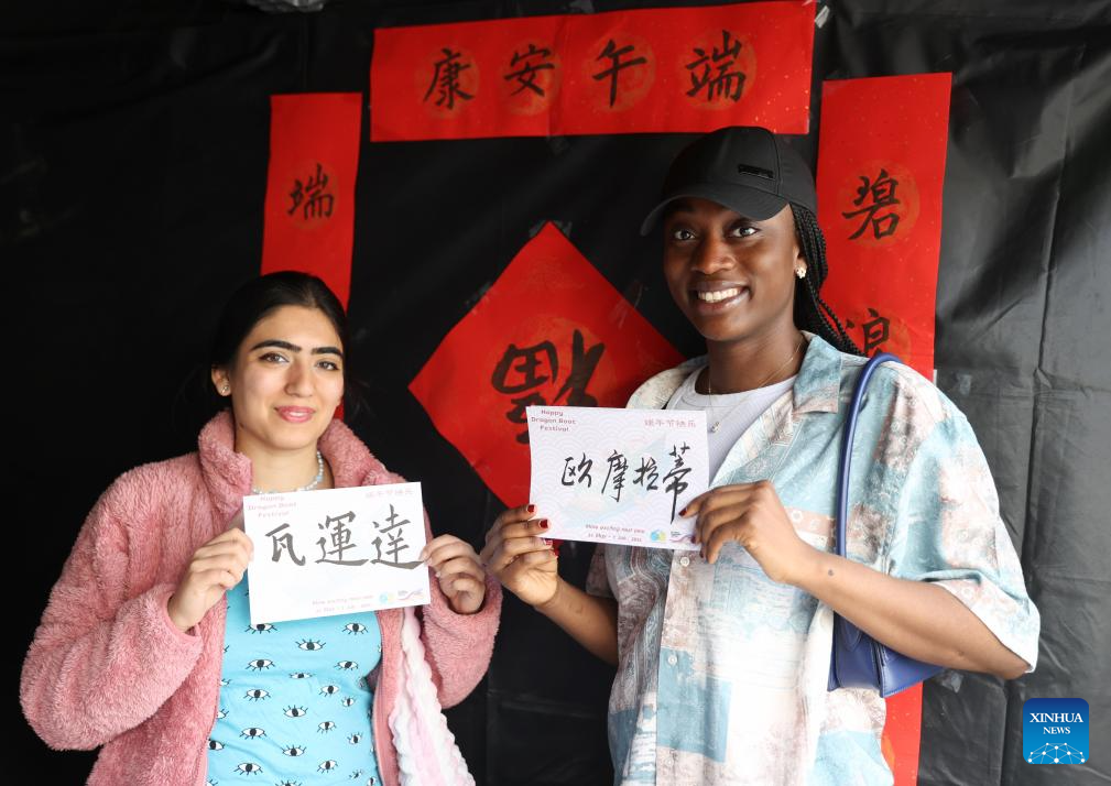 Visitors show their Chinese names during the 2024 UK Chinese Dragon Boat Festival in Salford, Britain, June 8, 2024. (Xinhua/Li Ying)