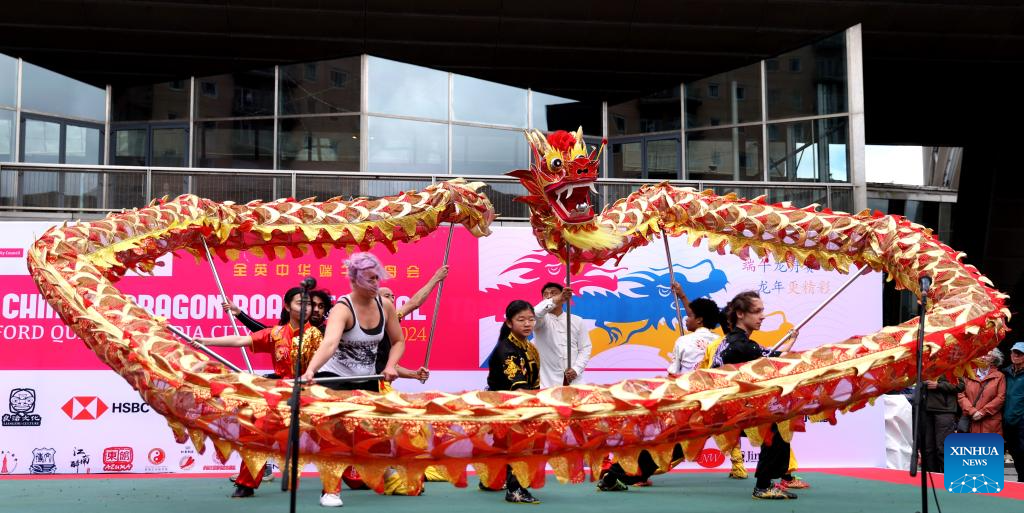 Actors perform dragon dance during the 2024 UK Chinese Dragon Boat Festival in Salford, Britain, June 8, 2024. (Xinhua/Li Ying)