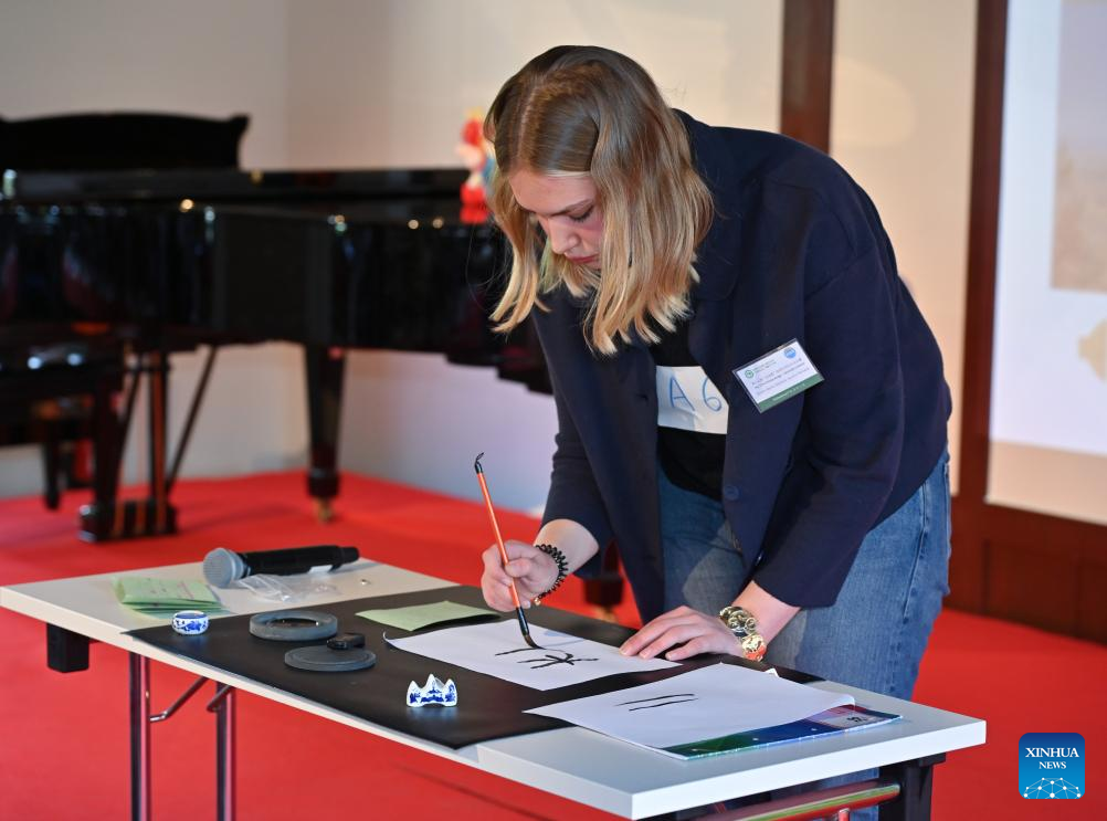 A contestant performs calligraphy during a talent display in the 17th "Chinese Bridge" language proficiency competition for middle school students in Hamburg, Germany, June 8, 2024.