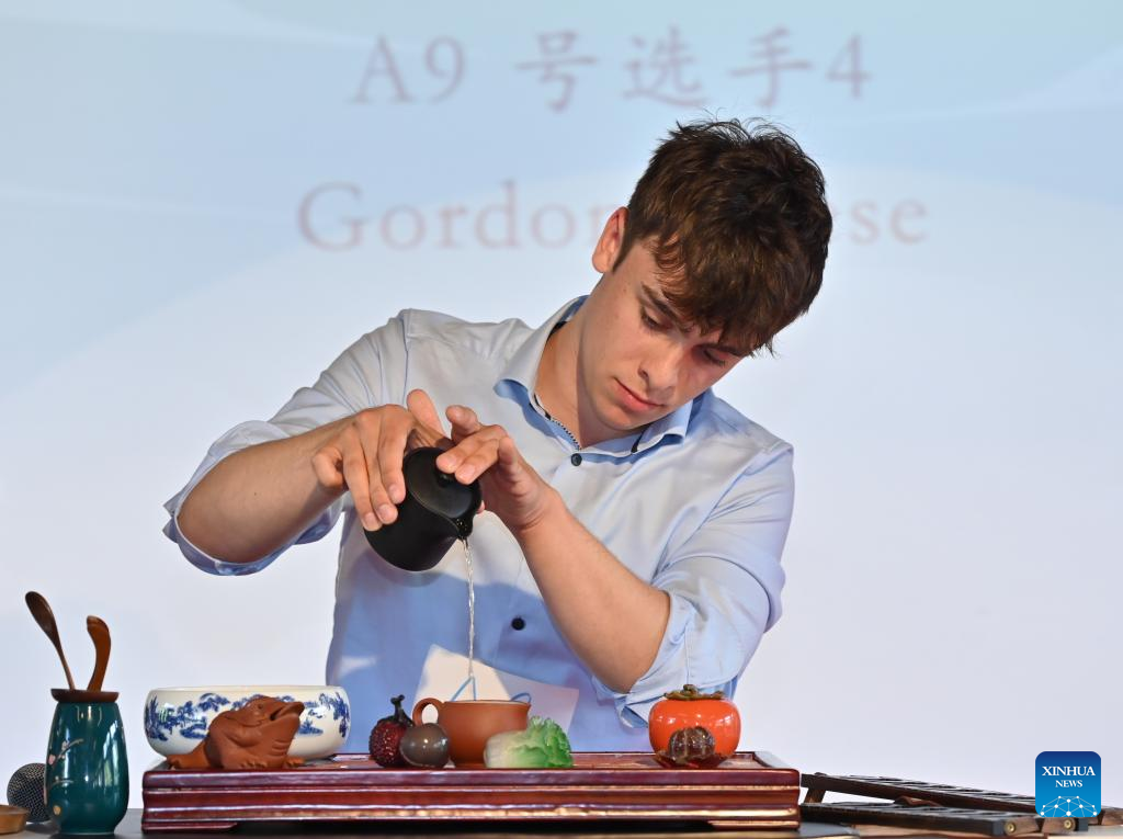 A contestant performs tea art during a talent display in the 17th "Chinese Bridge" language proficiency competition for middle school students in Hamburg, Germany, June 8, 2024.