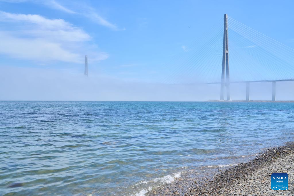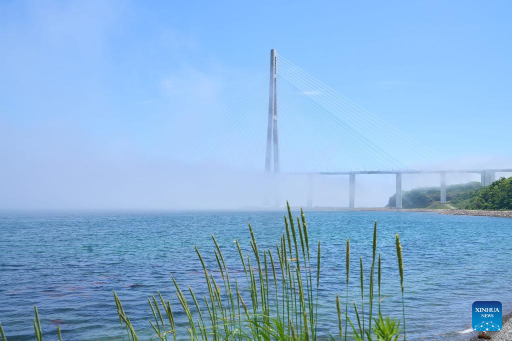 This photo taken on June 10, 2024 shows the Russky Bridge amid advection fog in Vladivostok, Russia. (Photo by Guo Feizhou/Xinhua)