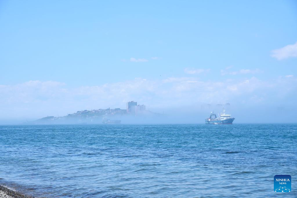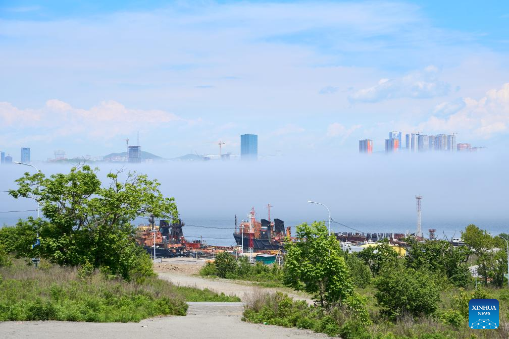 This photo taken on June 10, 2024 shows advection fog in downtown Vladivostok, Russia. (Photo by Guo Feizhou/Xinhua)