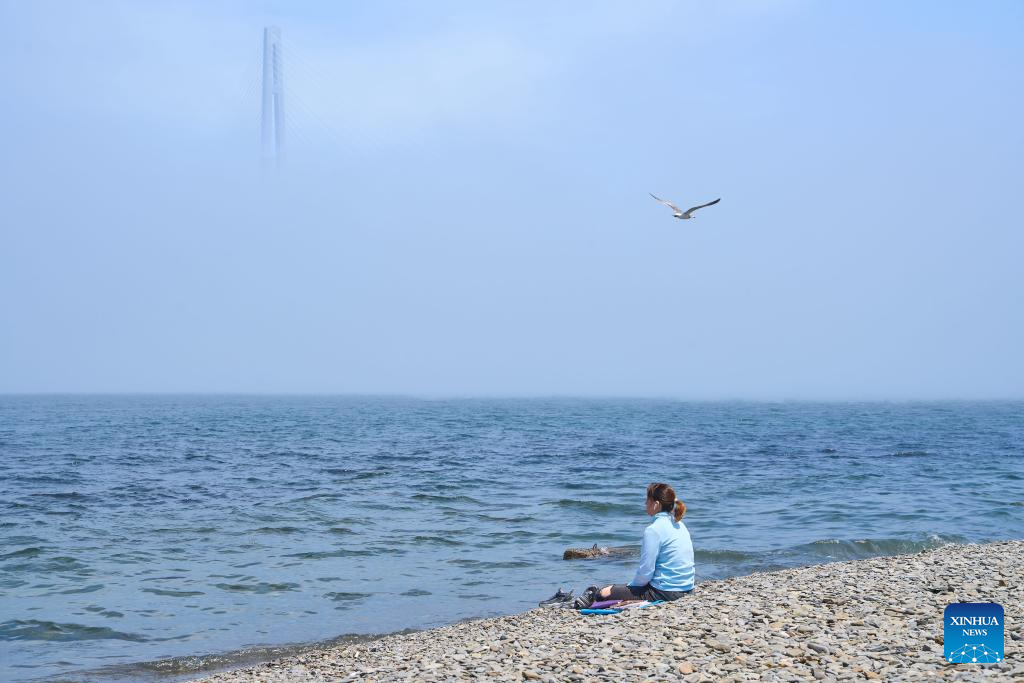 A woman looks at the Russky Bridge amid advection fog in Vladivostok, Russia, June 10, 2024. (Photo by Guo Feizhou/Xinhua)