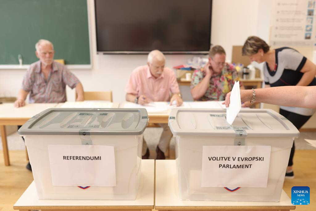 People vote at a polling station for the European Parliament elections in Ljubljana, Slovenia, June 9, 2024.