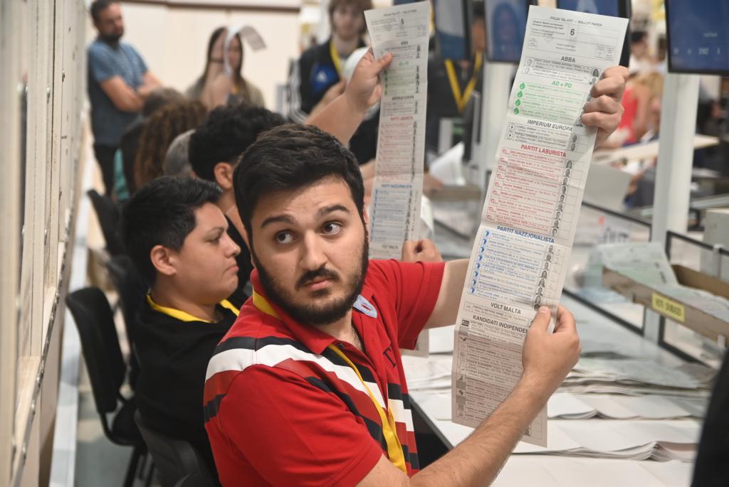 A man holds up a vote at a counting hall in Naxxar, Malta, June 9, 2024.