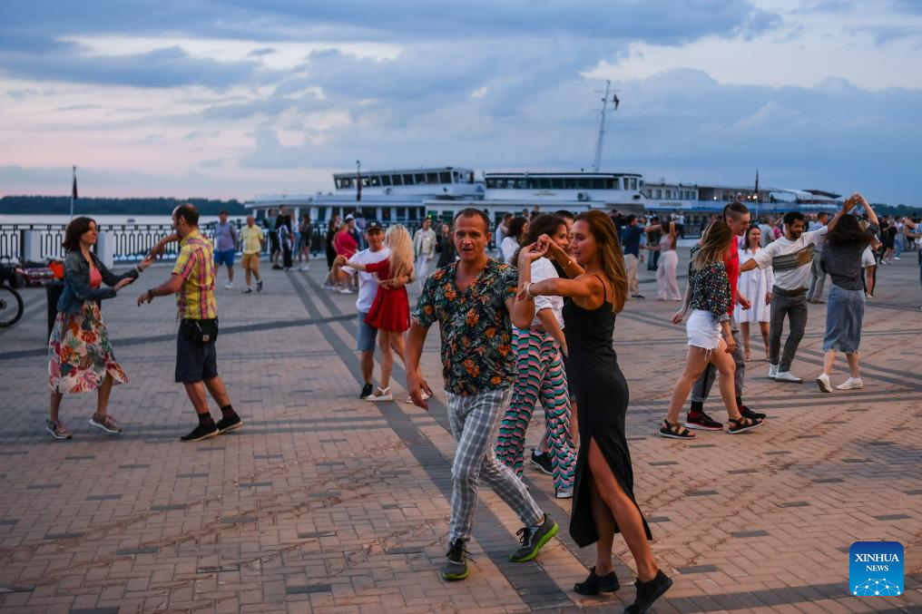 People dance on a riverside street in Nizhny Novgorod, Russia, June 9, 2024. (Xinhua/Cao Yang)
