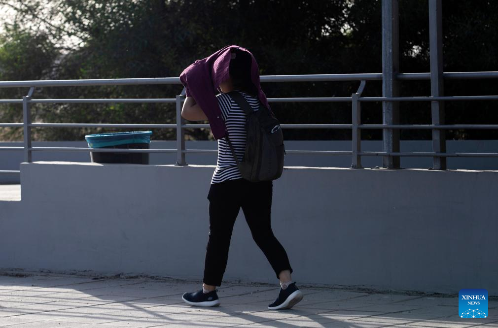 A woman hides her head during a heatwave in Nicosia, Cyprus, on June 14, 2024. An elderly woman has died and several other people have been hospitalized with heatstroke symptoms as temperatures in Cyprus soared on Friday to an all-time June high of 45 degrees Celsius, the country's health authorities announced. (Photo by George Christophorou/Xinhua)