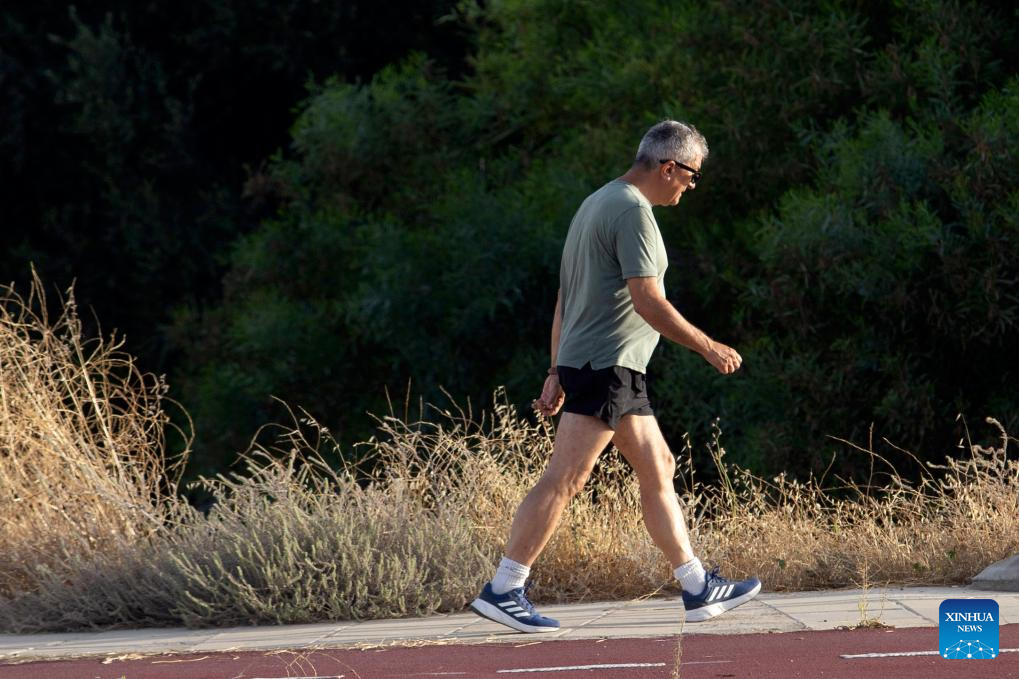 A man walks during a heatwave in Nicosia, Cyprus, on June 14, 2024. An elderly woman has died and several other people have been hospitalized with heatstroke symptoms as temperatures in Cyprus soared on Friday to an all-time June high of 45 degrees Celsius, the country's health authorities announced. (Photo by George Christophorou/Xinhua)