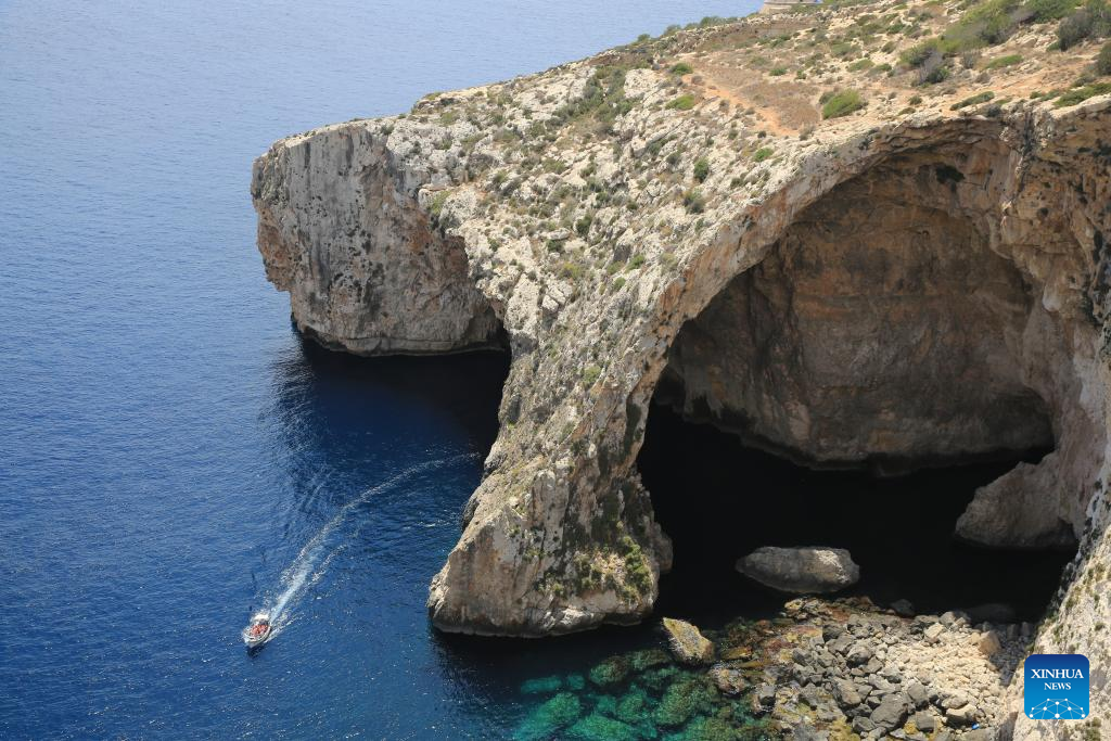 A boat sails around the Blue Grotto in Qrendi, Malta, on June 14, 2024. The Blue Grotto, located in southern Malta, is one of Malta's most popular natural attractions. (Xinhua/Chen Wenxian)