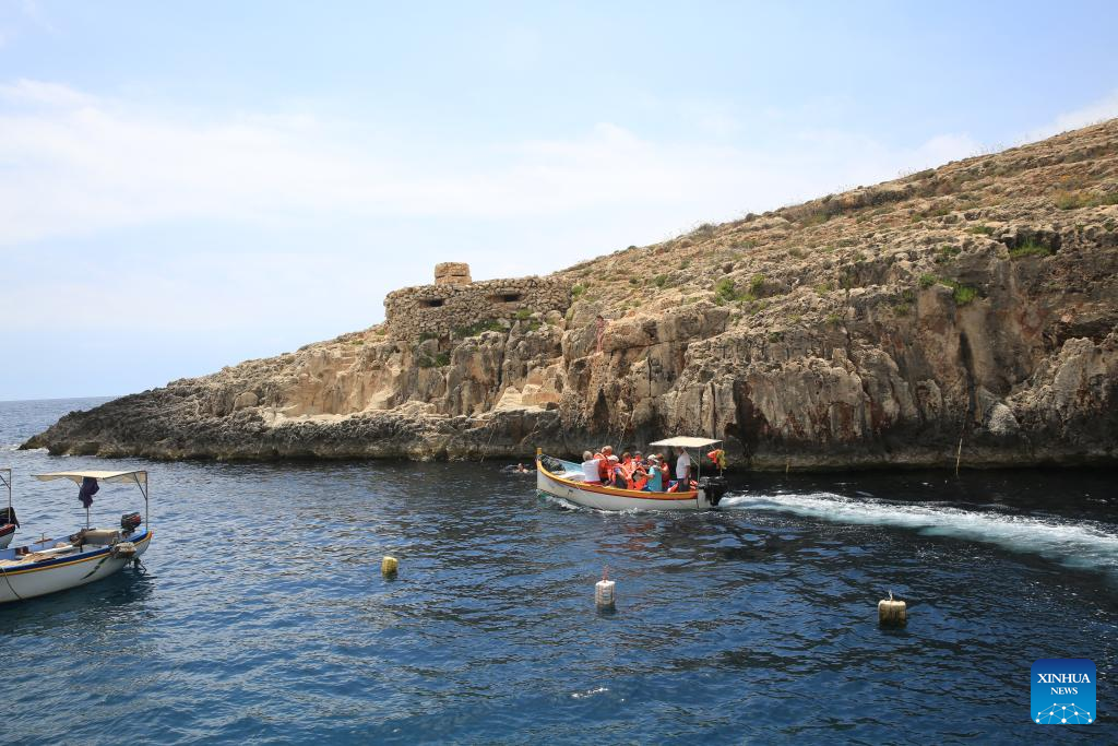People take a boat to the Blue Grotto in Qrendi, Malta, on June 14, 2024. The Blue Grotto, located in southern Malta, is one of Malta's most popular natural attractions. (Xinhua/Chen Wenxian)