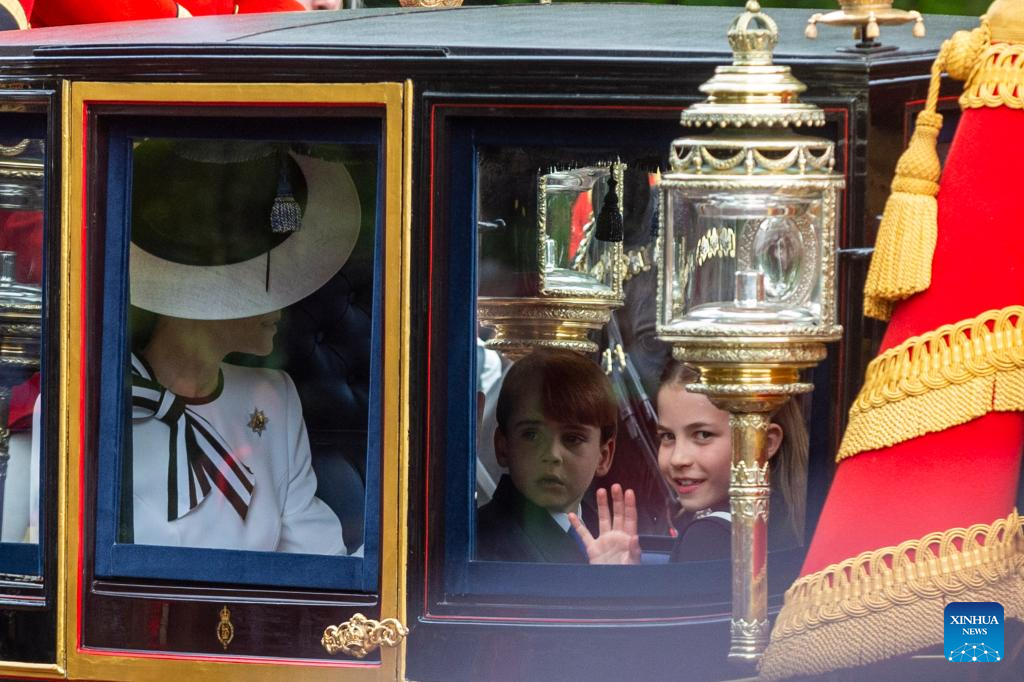 Britain's Catherine (L), Princess of Wales, rides a royal carriage with Princess Charlotte, Prince George and Prince Louis, during the Trooping the Colour parade to honour Britain's King Charles III on his official birthday in London, Britain, on June 15, 2024. (Photo by Stephen Chung/Xinhua)