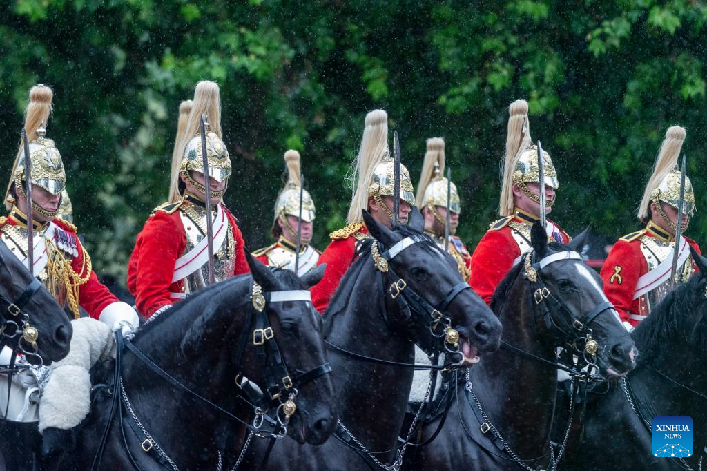 Members of the Household Division march during the Trooping the Colour parade to honour Britain's King Charles III on his official birthday in London, Britain, on June 15, 2024. (Photo by Stephen Chung/Xinhua)