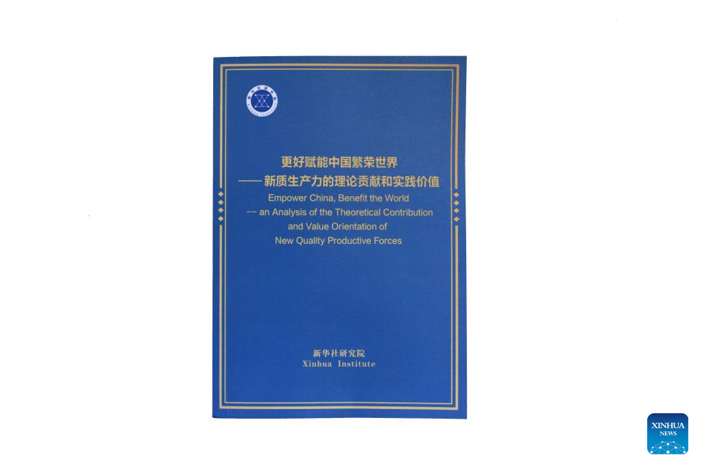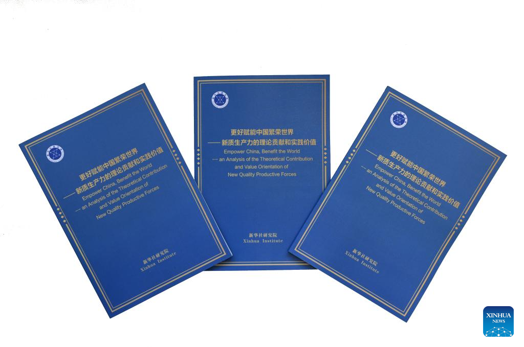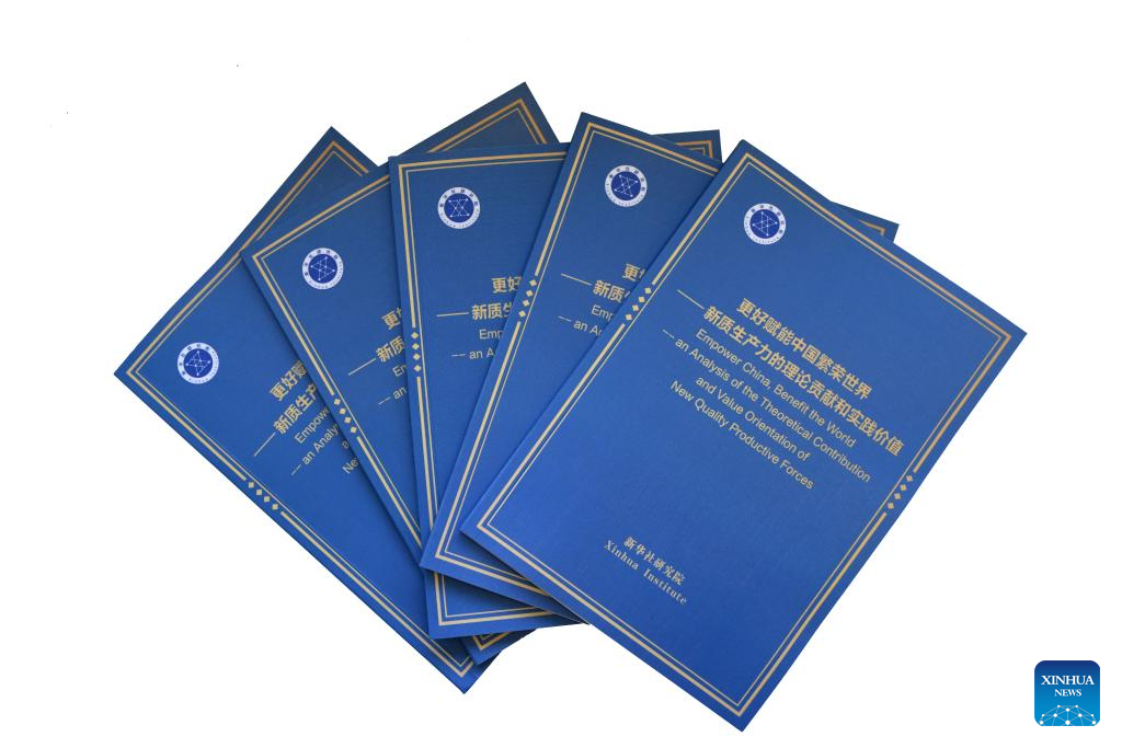 This photo shows the report "Empower China, Benefit the World -- an Analysis of the Theoretical Contribution and Value Orientation of New Quality Productive Forces" (Chinese and English editions). The report on new quality productive forces was launched in Brussels, Belgium on Wednesday by Xinhua Institute, a high-end think tank of Xinhua News Agency.