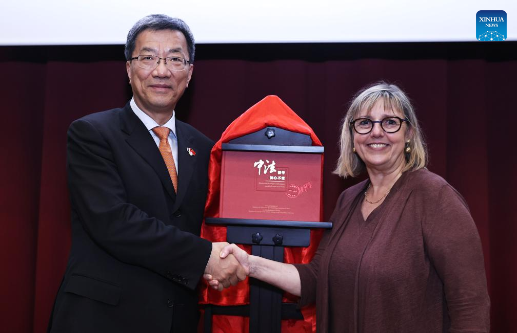 Chinese Minister of Education Huai Jinpeng (L) and French Minister of Higher Education and Research Sylvie Retailleau unveil a photo album marking the 60th anniversary of the establishment of diplomatic relations between China and France, during a Sino-French higher education forum in Paris, France, June 21, 2024.