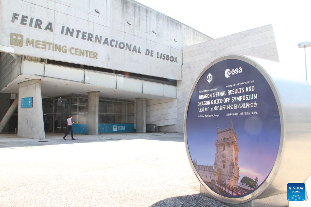 This photo taken on June 24, 2024 shows the exterior view of the venue for Dragon 5 final results and Dragon 6 kick-off symposium in Lisbon, Portugal. (Xinhua/Wen Xinnian)