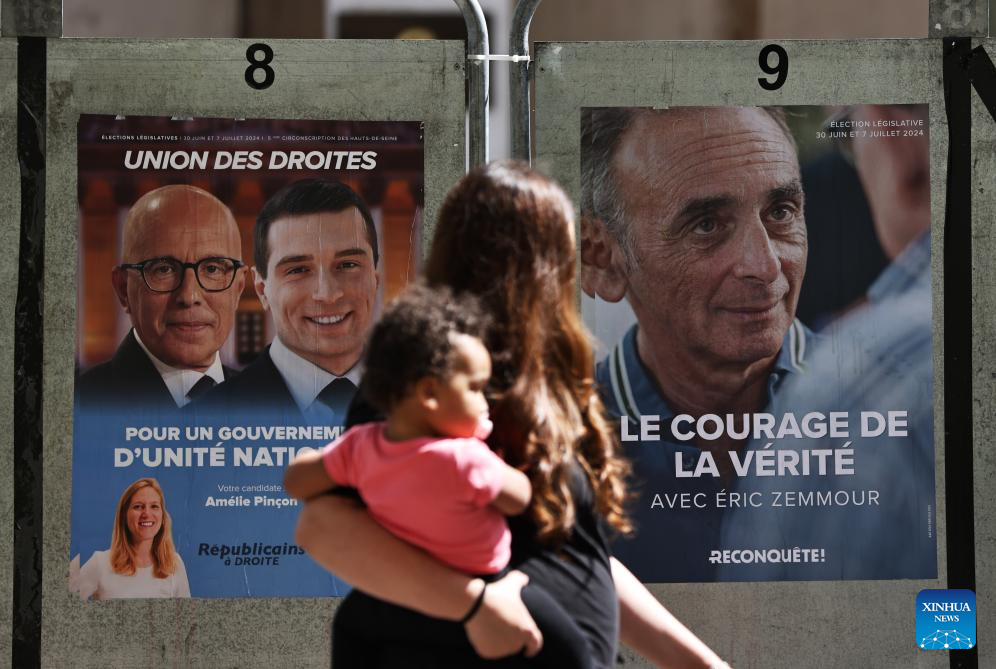 People walk past posters for legislative elections in Clichy-La-Garenne, near Paris, France, June 30, 2024. (Xinhua/Gao Jing)