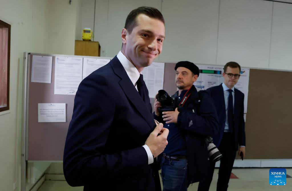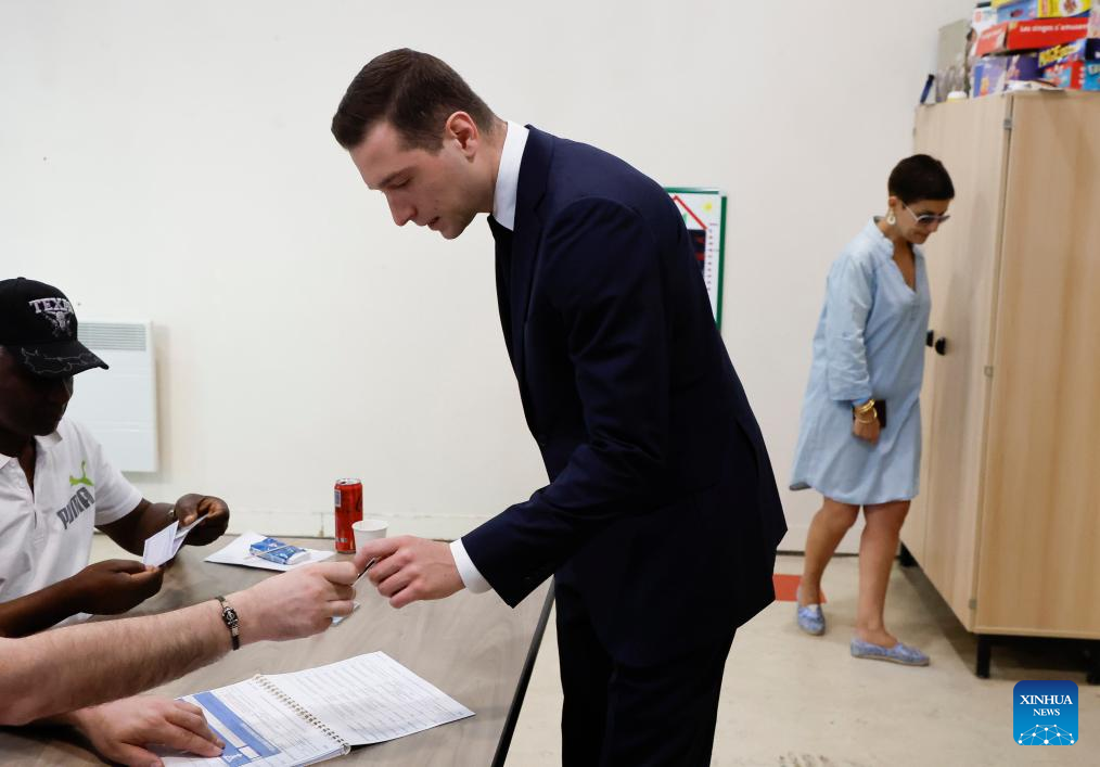French far-right National Rally (RN) President Jordan Bardella casts his ballot at a polling station in Garches, France, on June 30, 2024. (Photo by Henri Szwarc/Xinhua)