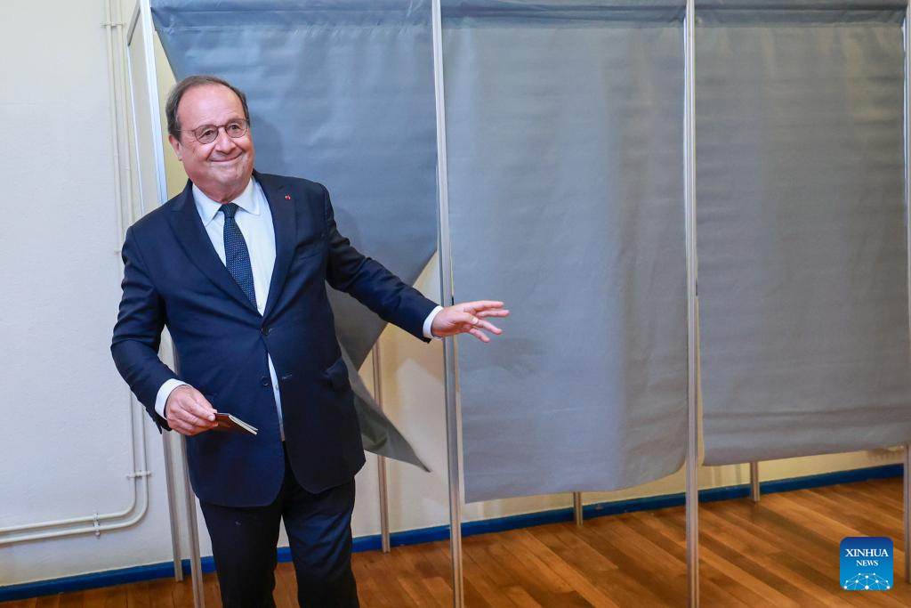 Former French President Francois Hollande arrives at a polling station in Tulle, France, on June 30, 2024. (Photo by Laetitia Notarianni/Xinhua)