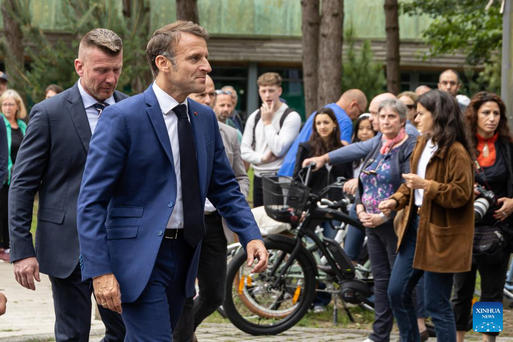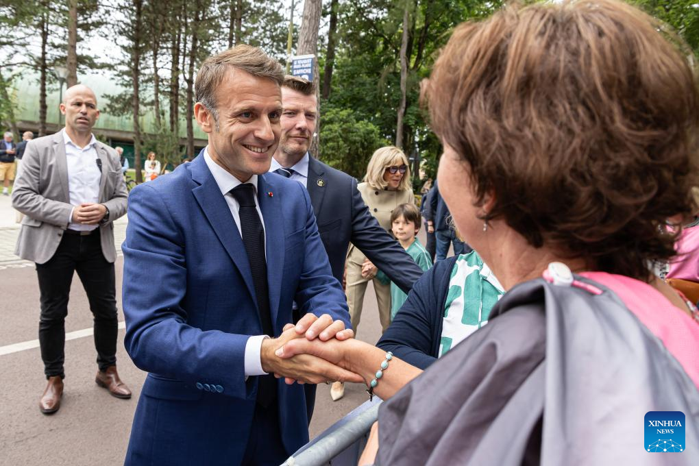 French President Emmanuel Macron meets with local residents outside a polling station in Le Touquet, northern France, June 30, 2024. (Photo by Frank Bonham/Xinhua)