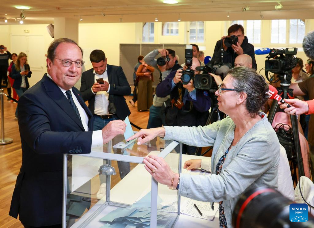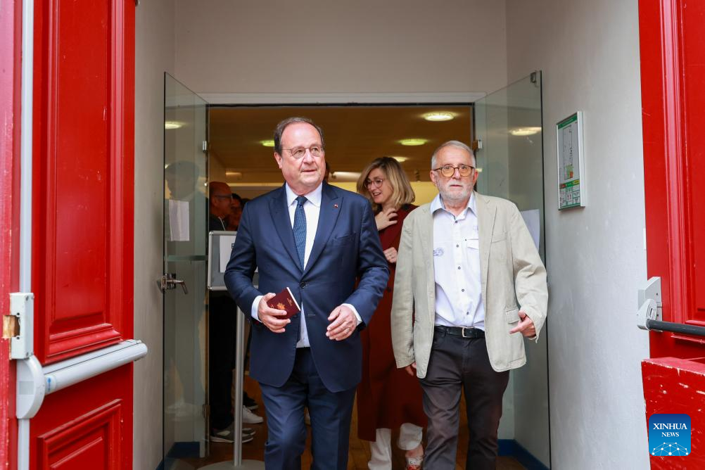 Former French President Francois Hollande (L) casts his ballot at a polling station in Tulle, France, on June 30, 2024. (Photo by Laetitia Notarianni/Xinhua)
