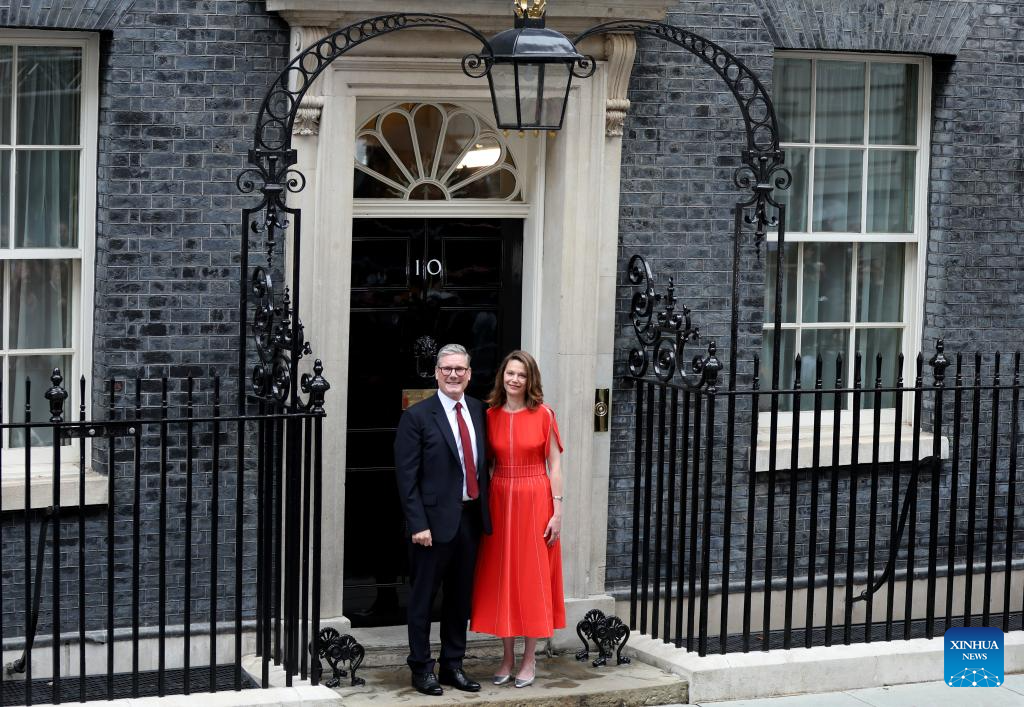 Keir Starmer (L) and his wife are pictured after he delivered his first speech as British prime minister in front of 10 Downing Street in London, Britain, July 5, 2024. Keir Starmer, who led the Labour Party to achieve a landslide victory in Britain's general election, officially became the new prime minister after meeting with King Charles III at Buckingham Palace in London on Friday. (Xinhua/Li Ying)