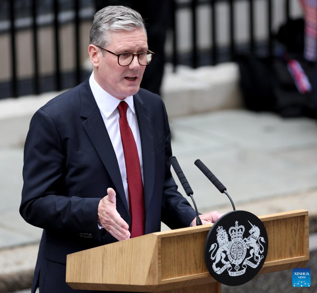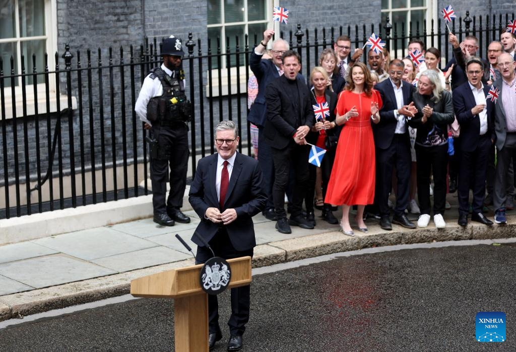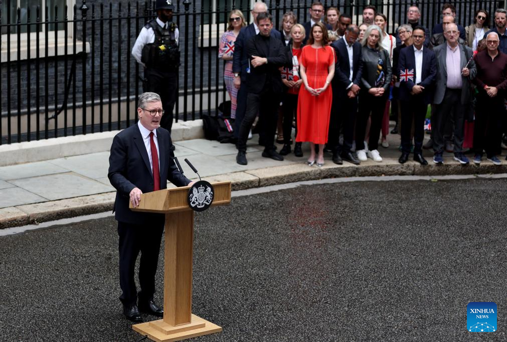 Keir Starmer delivers his first speech as British prime minister in front of 10 Downing Street in London, Britain, July 5, 2024. Keir Starmer, who led the Labour Party to achieve a landslide victory in Britain's general election, officially became the new prime minister after meeting with King Charles III at Buckingham Palace in London on Friday. (Xinhua/Li Ying)