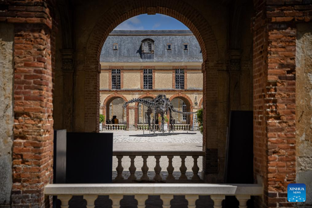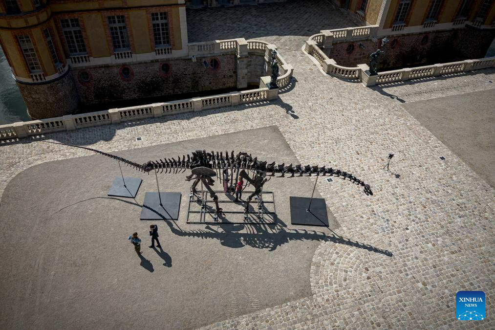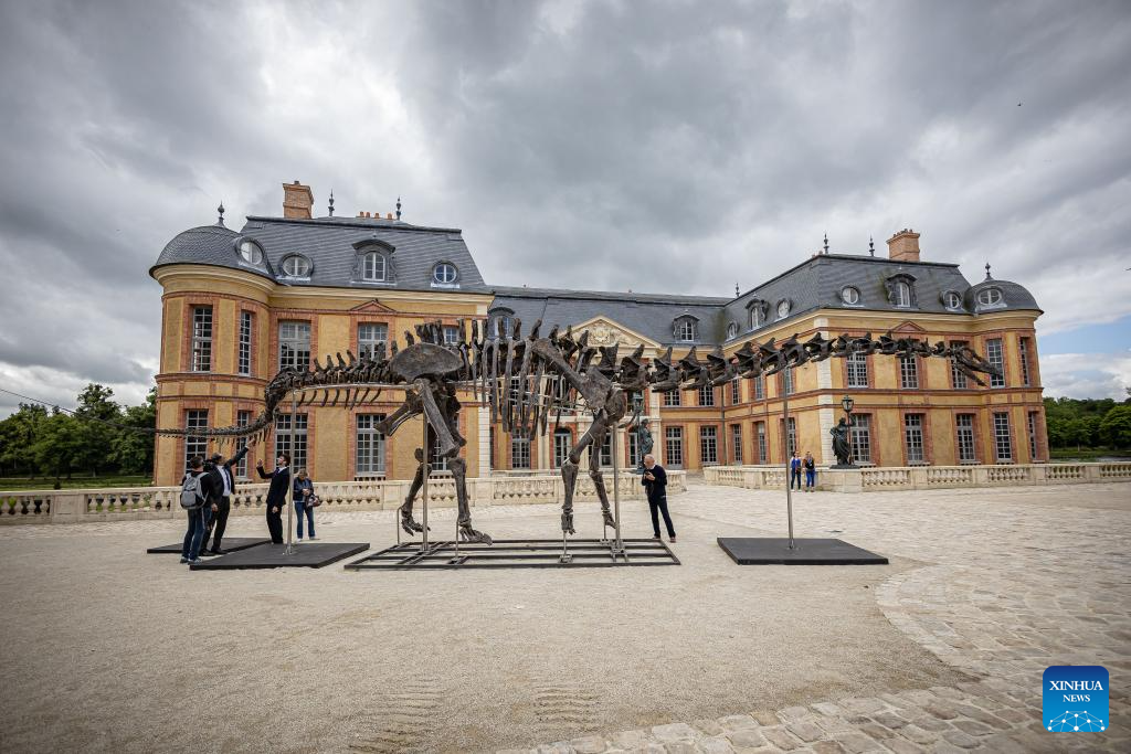 An Apatosaurus' dinosaur skeleton is displayed at the Dampierre-en-Yvelines castle in Dampierre-en-Yvelines, south of Paris, France, July 10, 2024. Measuring 21 meters long, this skeleton from about 150 million years ago is scheduled for auction in November this year. (Photo by Aurelien Morissard/Xinhua)