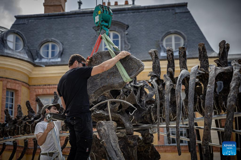 Workers assemble the skeleton of an Apatosaurus' dinosaur at the Dampierre-en-Yvelines castle in Dampierre-en-Yvelines, south of Paris, France, July 10, 2024. Measuring 21 meters long, this skeleton from about 150 million years ago is scheduled for auction in November this year. (Photo by Aurelien Morissard/Xinhua)