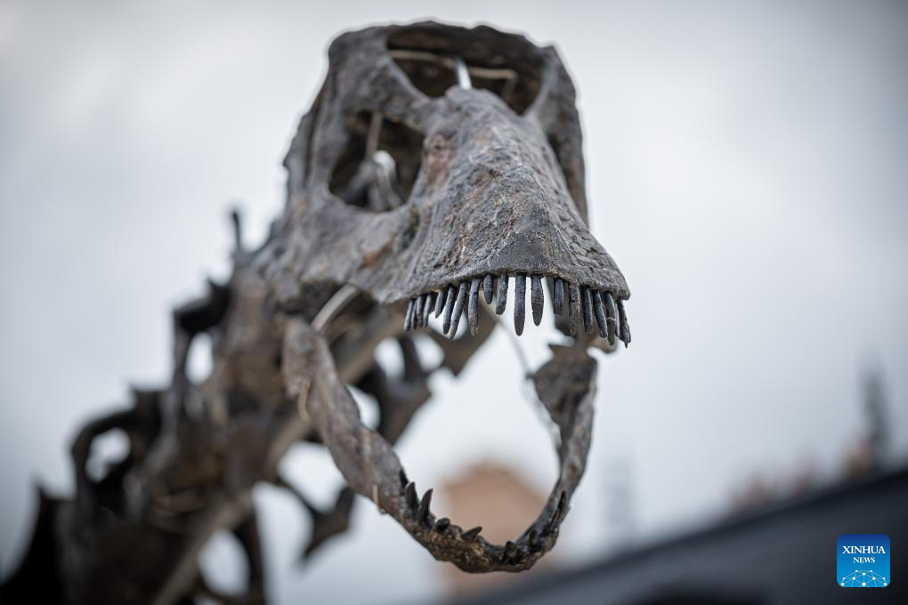 This photo taken on July 10, 2024 shows part of an Apatosaurus' dinosaur skeleton at the Dampierre-en-Yvelines castle prior to an auction in Dampierre-en-Yvelines, south of Paris, France. Measuring 21 meters long, this skeleton from about 150 million years ago is scheduled for auction in November this year. (Photo by Aurelien Morissard/Xinhua)