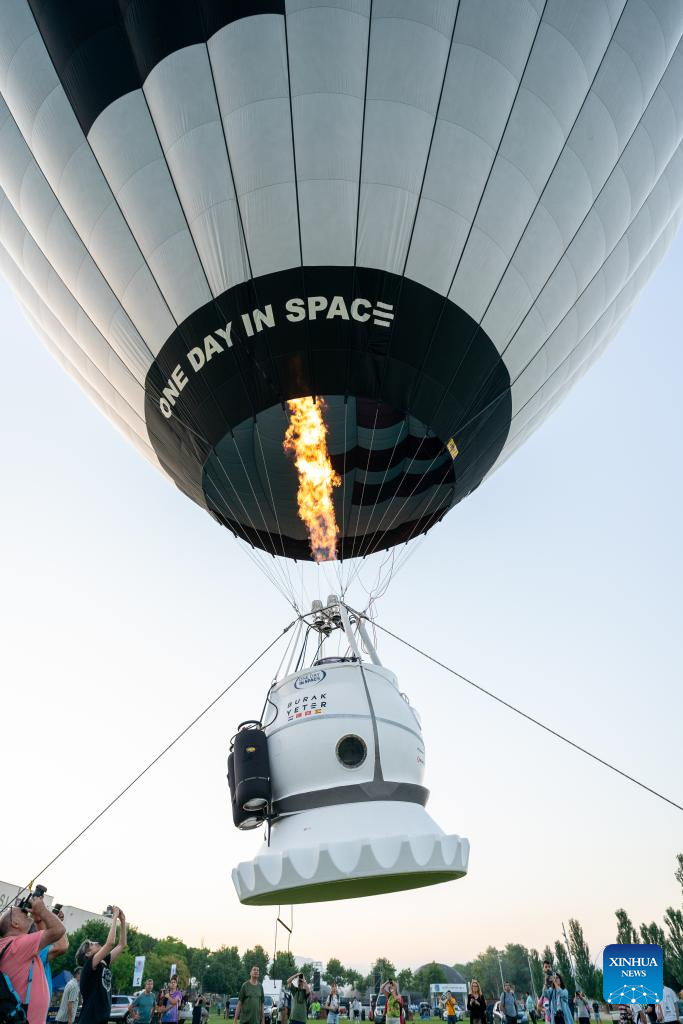 People look at a hot-air balloon ready to fly during European Balloon Festival 2024 in Igualada, Spain, on July 11, 2024. (Photo by Joan Gosa/Xinhua)