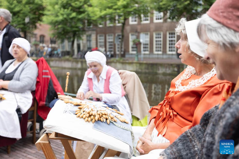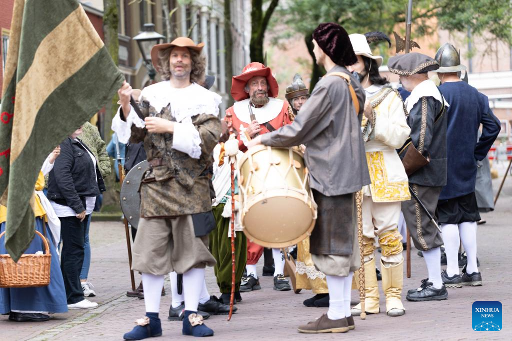 During the two-day event, the city's historic center is transformed into 17th-century setting to celebrate the life and work of Dutch painter Rembrandt van Rijn, whose birthplace is Leiden. (Photo by Sylvia Lederer/Xinhua)