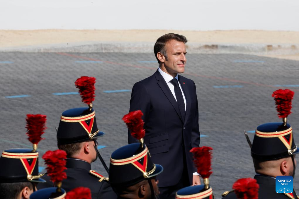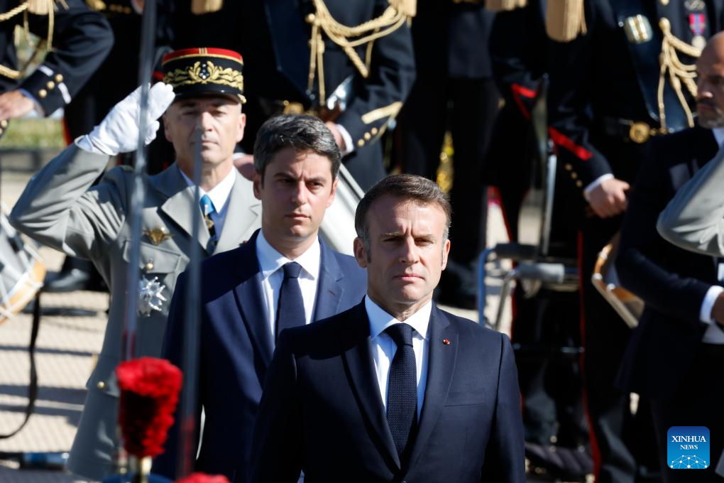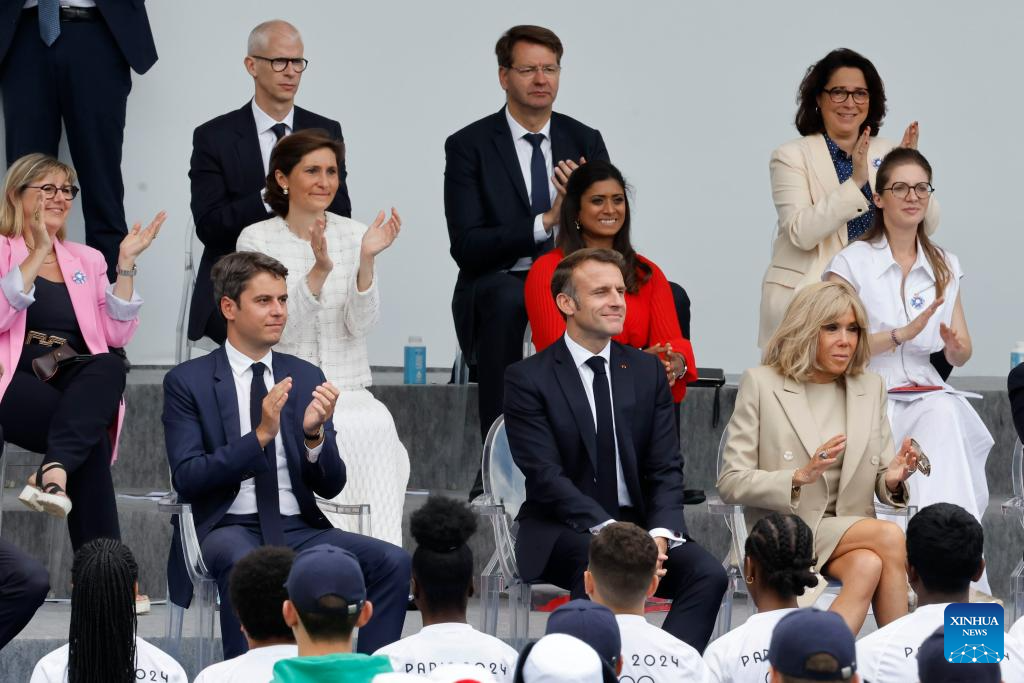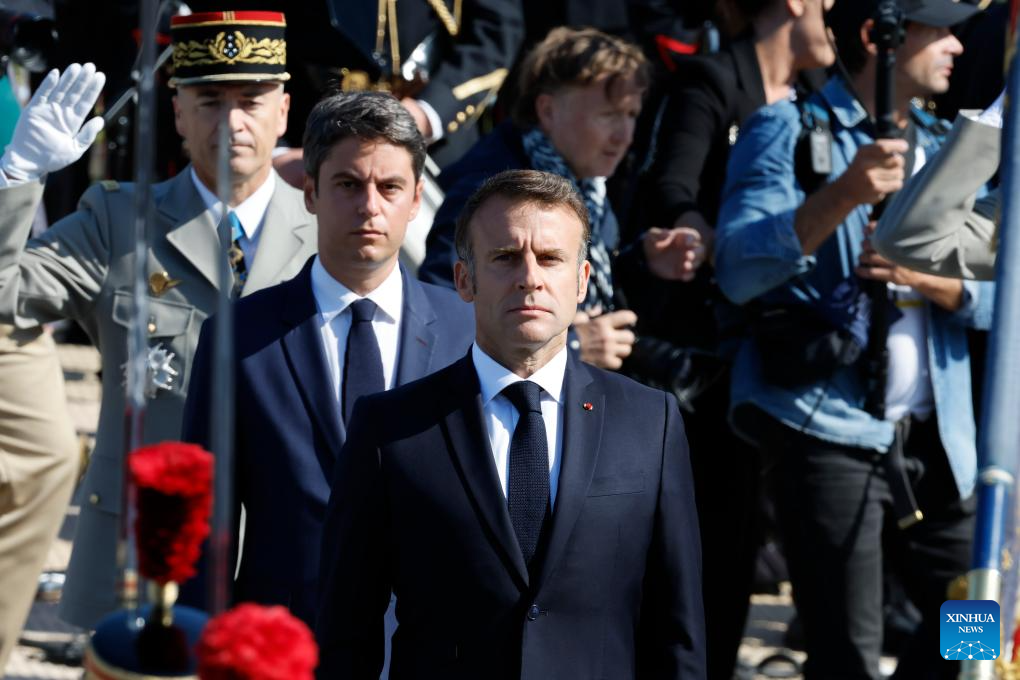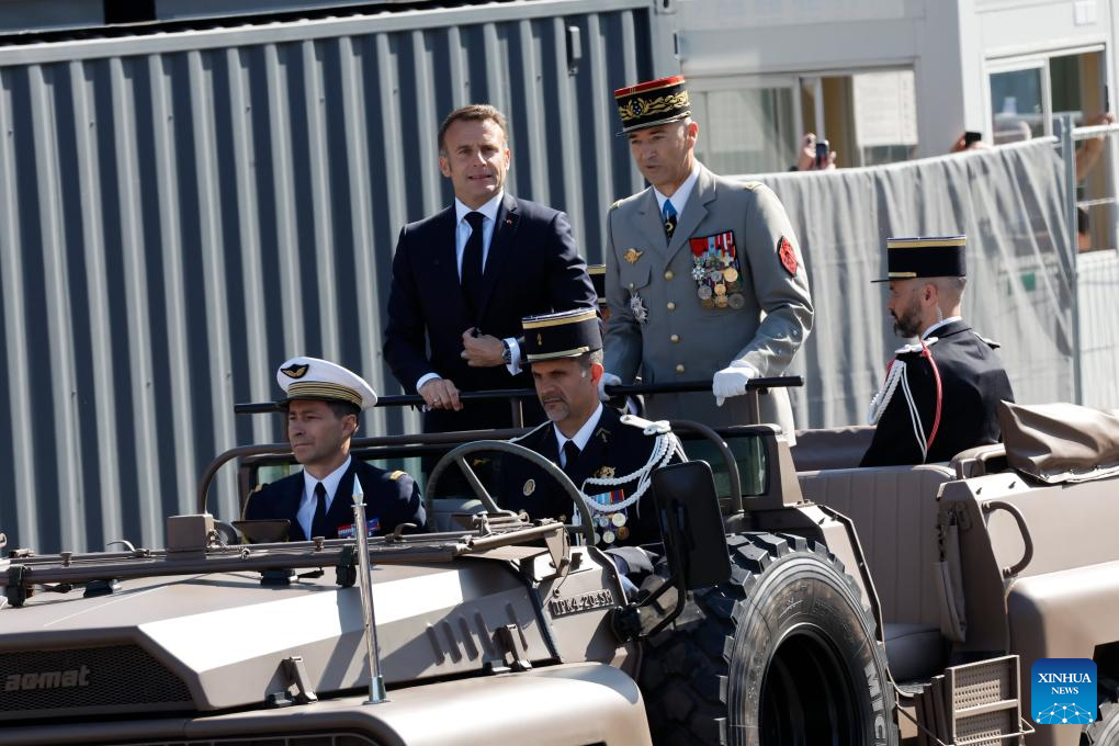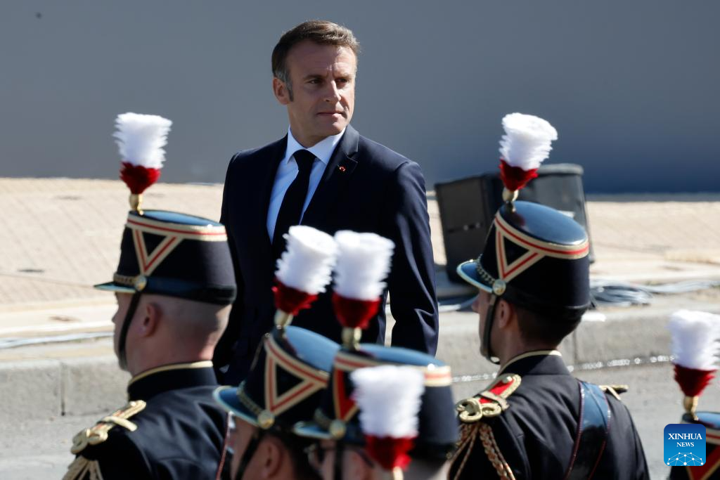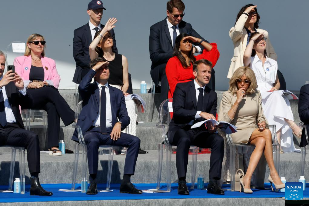 French President Emmanuel Macron (2nd R, front) attends the annual Bastille Day military parade in Paris, France, on July 14, 2024. (Photo by Henri Szwarc/Xinhua)