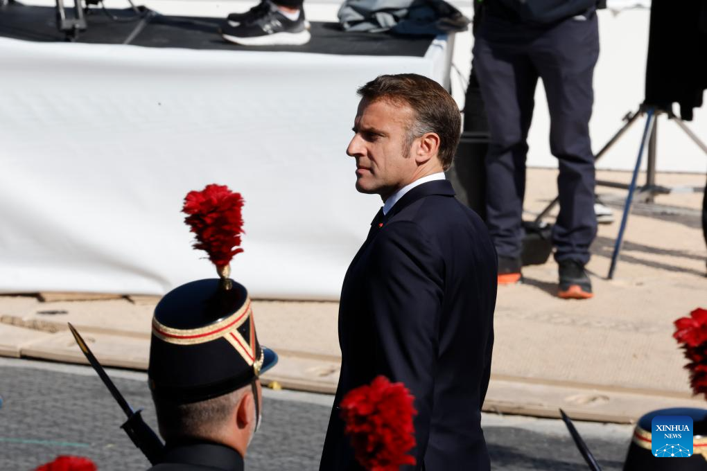 French President Emmanuel Macron attends the annual Bastille Day military parade in Paris, France, on July 14, 2024. (Photo by Henri Szwarc/Xinhua)
