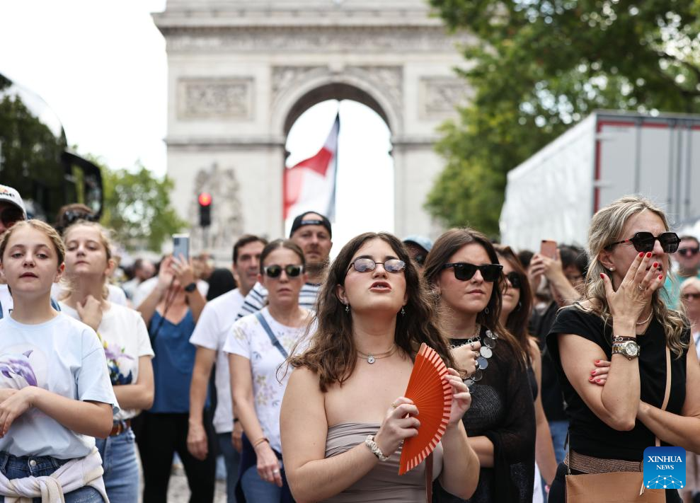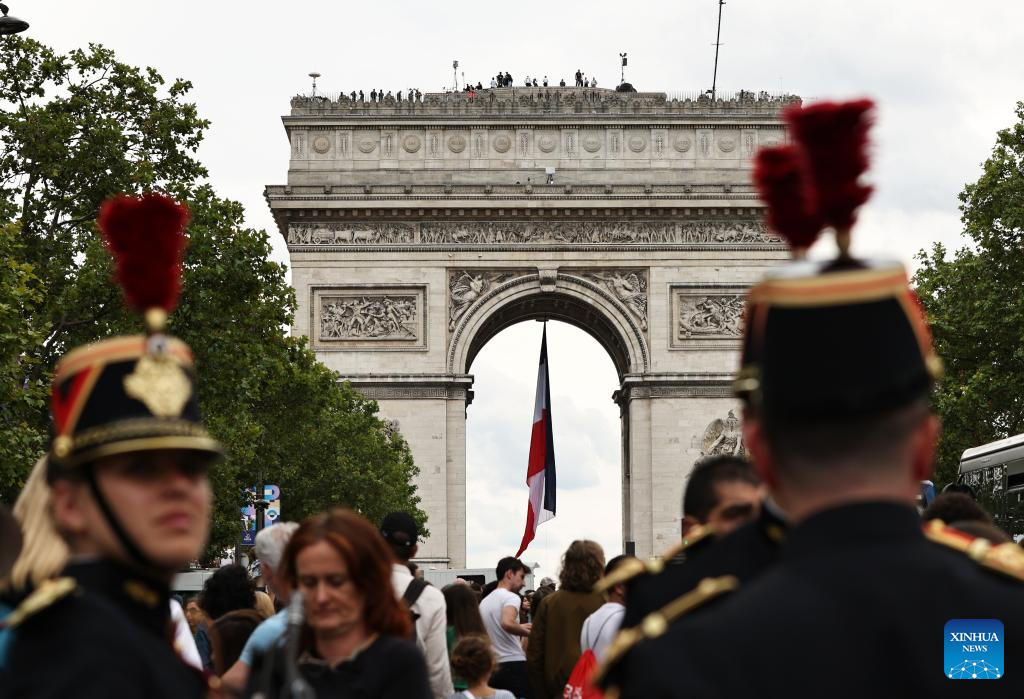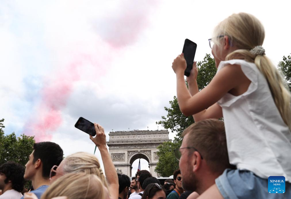 People gather to watch an aircraft performance during the Bastille Day military parade with the Arc de Triomphe in the background in Paris, France, on July 14, 2024. (Xinhua/Gao Jing)