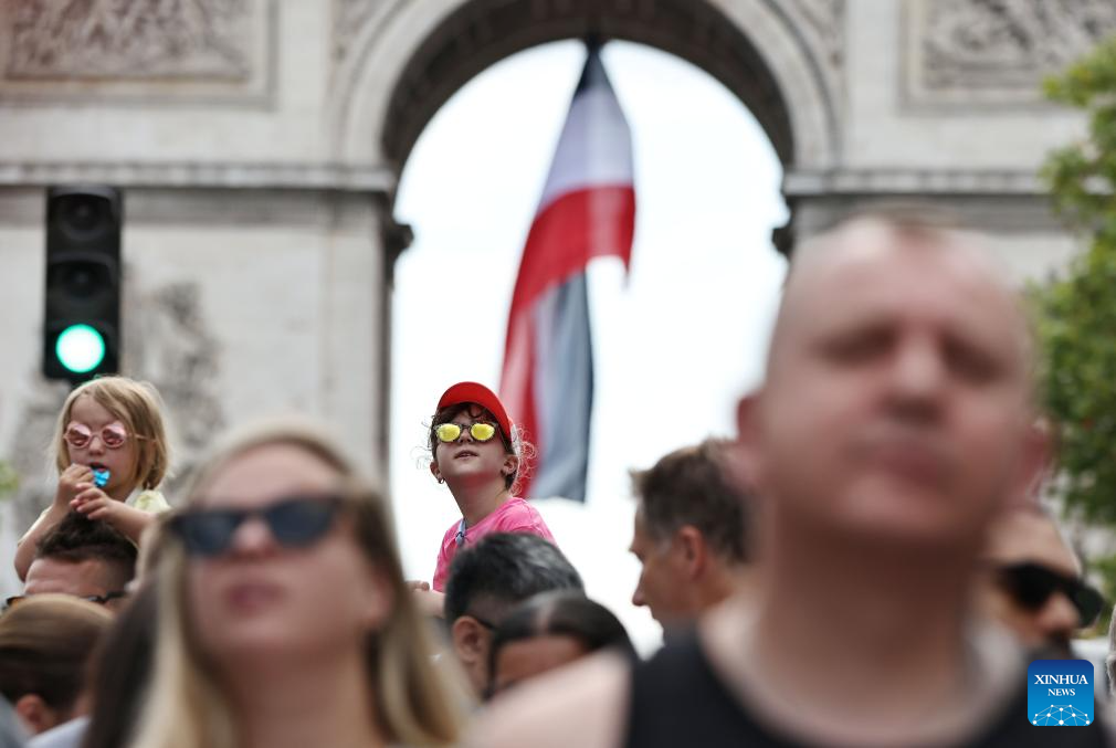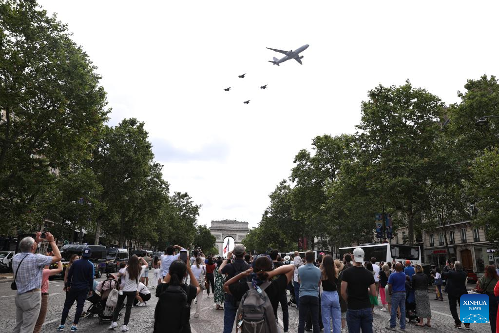 People gather to watch the French Air Force performance during the Bastille Day military parade with the Arc de Triomphe in the background in Paris, France, on July 14, 2024. (Xinhua/Gao Jing)