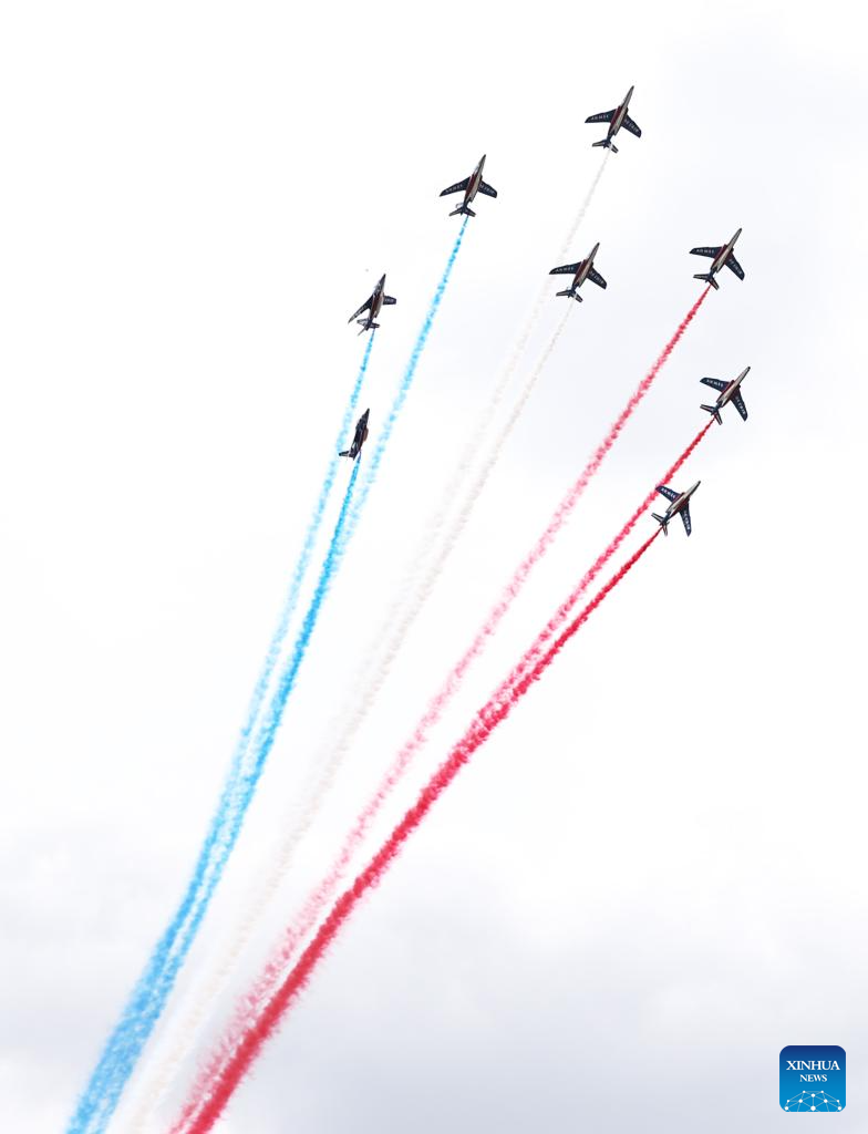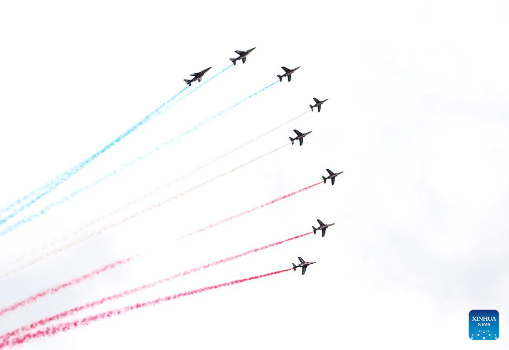 French Air Force elite acrobatic flying team "Patrouille de France" (PAF) performs during the Bastille Day military parade in Paris, France, on July 14, 2024. (Xinhua/Gao Jing)