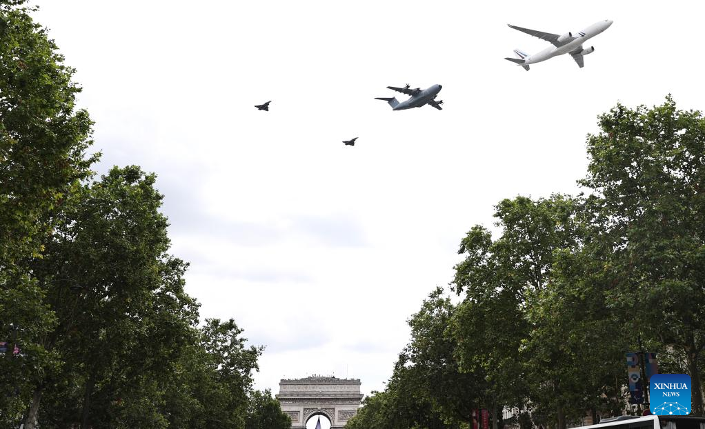 French Air Force airplanes perform during the Bastille Day military parade in Paris, France, on July 14, 2024. (Xinhua/Gao Jing)