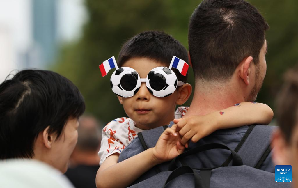 People gather to watch an aircraft performance during the Bastille Day military parade in Paris, France, on July 14, 2024. (Xinhua/Gao Jing)