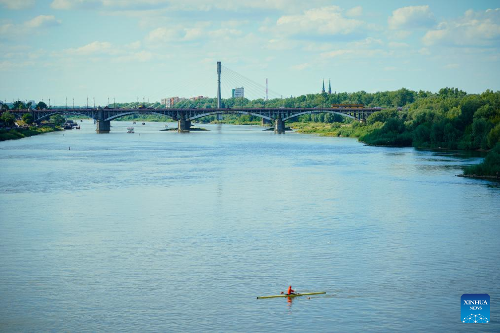 A kayaker paddles on the Vistula River in Warsaw, Poland, July 14, 2024. (Photo by Jaap Arriens/Xinhua)