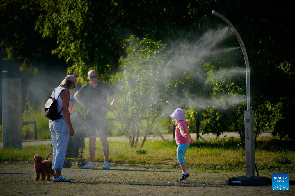 People cool themselves off around a cooler along the Vistula River in Warsaw, Poland, July 14, 2024. (Photo by Jaap Arriens/Xinhua)