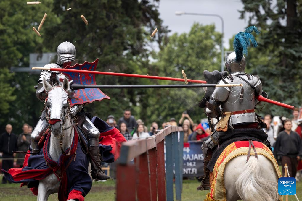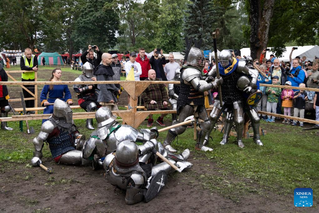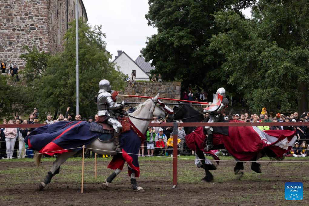 Contestants in heavy armors compete during the Turku Castle Tournament 2024 in Turku, Finland, July 14, 2024.