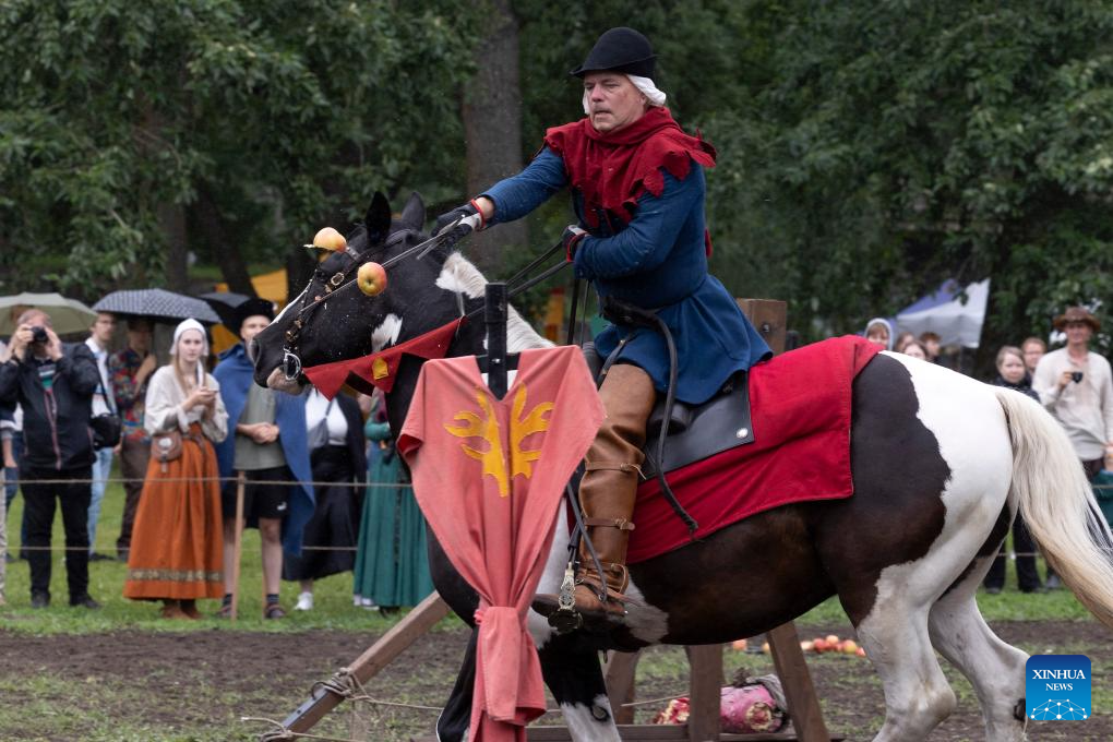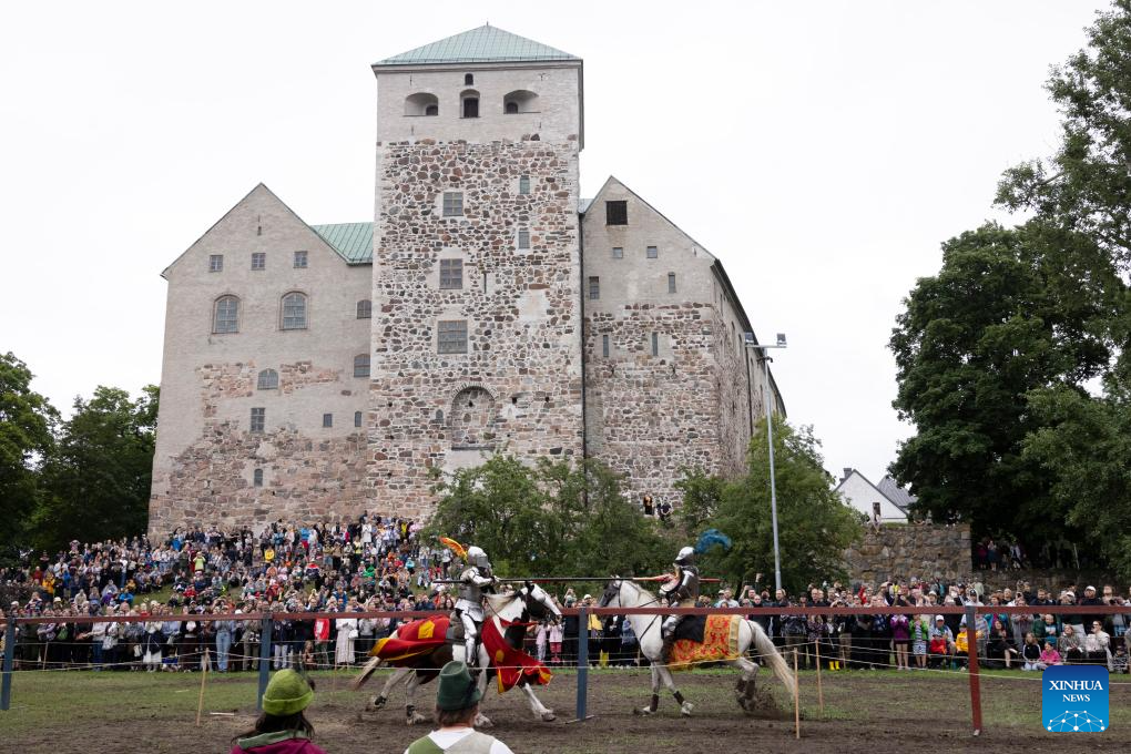 A contestant shows weapon maneuvering skills during the Turku Castle Tournament 2024 in Turku, Finland, July 14, 2024.