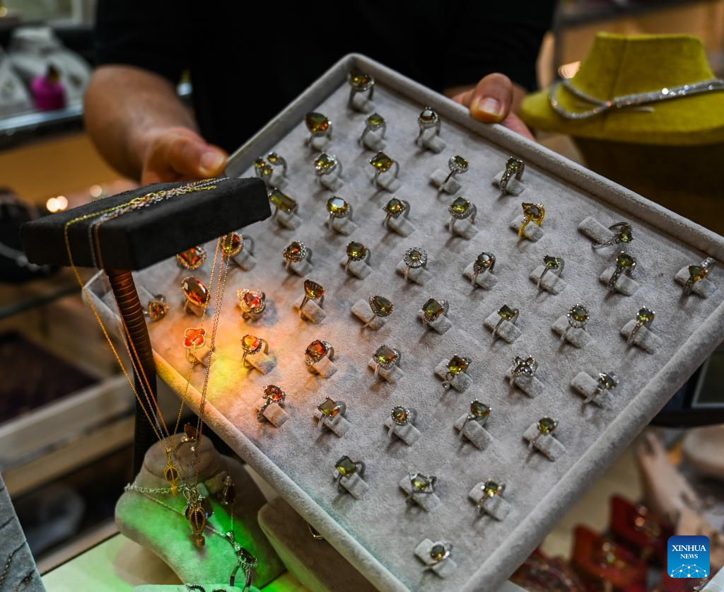 A jewelry store owner displays goods at the Grand Bazaar of Istanbul, Türkiye, July 15, 2024. The time-honored Grand Bazaar, which boasts a history of more than 500 years, is one of the oldest and largest bazaars in the world. (Xinhua/Liu Lei)